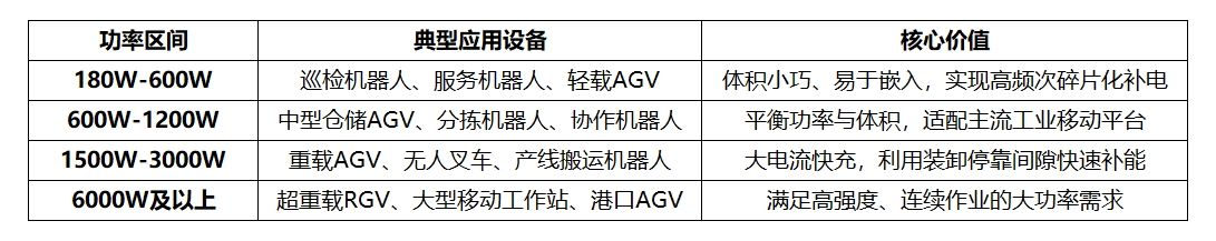 在汽车总装、重型机械制造、港口码头等场景,重载AGV和无人叉车承担着吨级物料的搬运任务。采用3000W/6000W无线快充,利用装卸货停靠的1-3分钟即可快速补能,一天累计停靠数十次,足以支撑全天高强度作业。